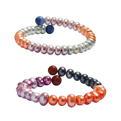 Set of 2 - Multi Color Pearl & Multi Color Agate Adjustable Bangle 145.00 Ct.
