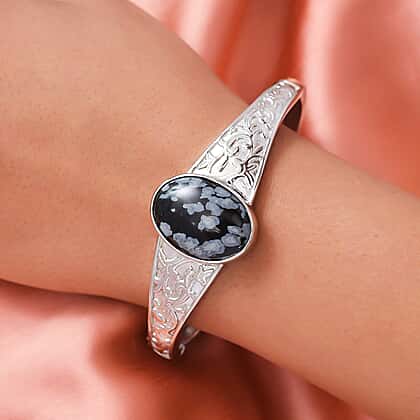 A Snowflake Obsidian Oval 25x18mm Cabochon Cut is set in a bezel on a lovely Snowflake Obsidian bangle. The artistic work surrounding the gemstone resembles the petals of a fully bloomed flower. With a fantastic finish, the bangle features intricate designs inspired by nature. Women of all ages can pull this off with ease, thanks to the 7.5-inch length. with round shape design, this can be worn in a matter of seconds. This bangle's scrollwork in an oxidised finish gives it a vintage-inspired look.