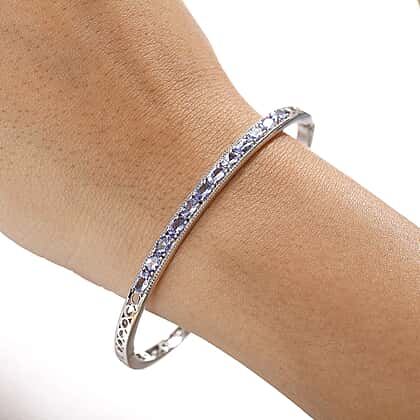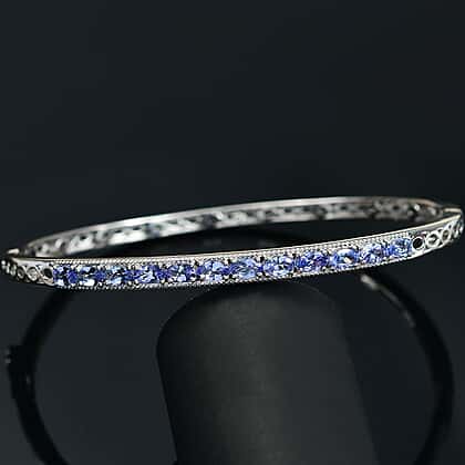 Gracefully designed for those who love understated beauty, this 7.5-inch tanzanite openable bangle captures the magic of rare colour and craftsmanship. A continuous line of vivid violet-blue tanzanites glimmers with every movement, symbolising calm and spiritual growth. The sleek sterling silver body, finished with rhodium overlay, ensures a tarnish-resistant, hypoallergenic surface that stays radiant and is gentle on sensitive skin. With its secure, openable clasp and finely detailed edges, this bangle brings sophistication and meaning to your everyday look or special occasion wear.