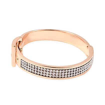 White Austrian Crystal Belt Buckle Hinged Bangle in Yellow Gold Tone 6.5 Inch