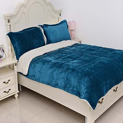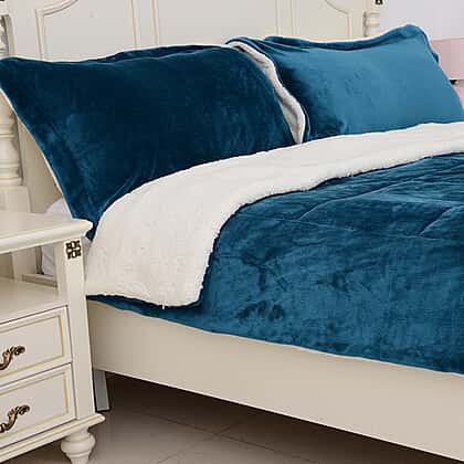 3 Piece Set Super Soft and Plush Flannel Sherpa Comforter Size 220x225 Cm and 2 Pillow Cases 50x70x5 Cm in Teal Blue