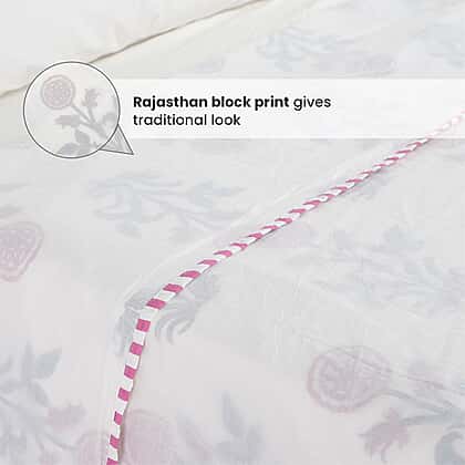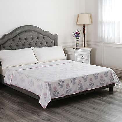 This block-printed cotton dohar is durable, foldable, and lightweight allowing you to feel snug inside and find warmth on a chilly day. The dohar is made with muslin sourced from 100% cotton that is breathable and machine washable. The fine floral print in shades of turquoise and red printed across the length of the quilt lends an all-weather look. Block printing enhances the ethnic appeal. The dohar is triple-layered and has a comfortable size of 200x200 cm.