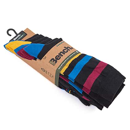 This Bench 7-pack Socks set features a bold and vibrant design, showcasing a mix of colourful stripes in blue, yellow, red, and black. The socks are crafted from recycled yarns, emphasising sustainability while keeping you stylish. The stripe patterns provide a modern and eye-catching look, perfect for adding a splash of colour to your daily wear. With a comfortable fit for UK sizes 6-11, these socks offer both fashion and function, making them an ideal choice for casual or everyday wear.