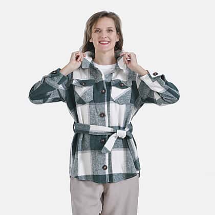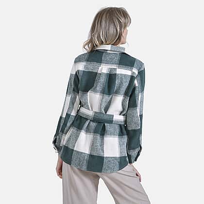 Upgrade your winter wardrobe with the stylish La Marey Checked Belted Winter Shirt, crafted from 100% polyester for warmth and comfort. This shirt has a classic green and white check pattern and combines timeless charm with modern versatility. The belted waist adds a flattering silhouette, while the button-down design and pointed collar enhance its sophisticated appeal. Two chest pockets with flaps provide a functional touch. Perfect for layering, pair it with a turtleneck and jeans for a casual outing or wear it as a light jacket over a fitted top for a chic, layered look. Whether for errands or casual gatherings, this shirt adds effortless style to your winter wardrobe.