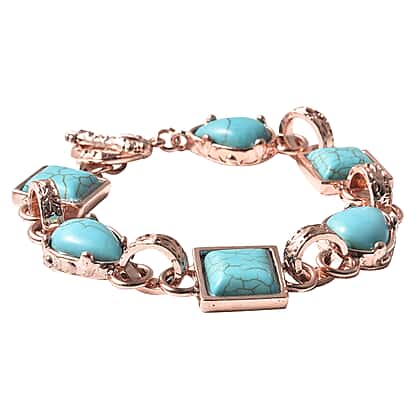 This fantastic 2-piece set featuring a Blue Howlite Station Bracelet and earrings in Rose Gold Tone is a steal. The station bracelet showcases the veined beauty of the blue howlite cabochons that have been meticulously placed in bezel enclosures. The bracelet sits boldly on your wrist drawing attention to intricately linked stations in rose gold tone.