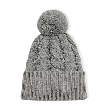 Chunky Cable Knit Beanie Hat with Faux Fur Pom-Pom - Grey