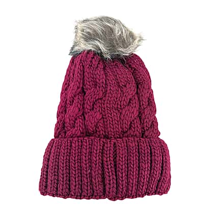Chunky Cable Knit Beanie Hat with Faux Fur Pom-Pom - Burgundy