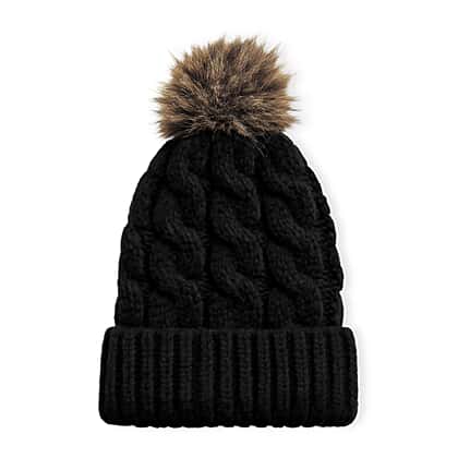 Chunky Cable Knit Double layer Sherpa Beanie Hat with Faux Fur Pom-Pom - Black