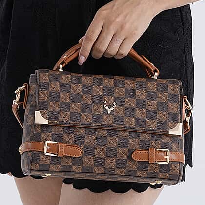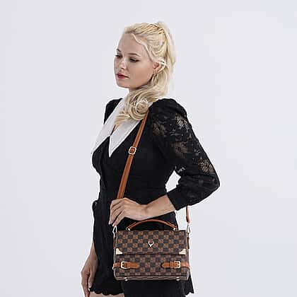 Displaying a designer-inspired geometric pattern sling handbag in light brown colour, it is a perfect fusion of style and class. The light brown colour is paired with rich tan rims and gold-tone hardware, creating a classy piece that complements every ensemble. The dark brown belt design with checkerboard design prints makes it suitable for elegant occasions and evening parties. It can be worn as a crossbody or can be carried by the top handle, making it ideal for everyday use, both for casual and formal events. With its adjustable strap, this handbag offers flexibility with style.