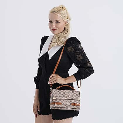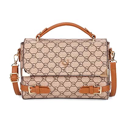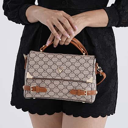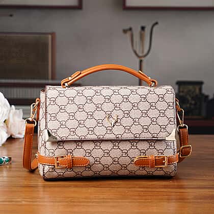 Displaying a designer-inspired geometric pattern sling handbag in light khaki colour, a perfect fusion of style and class. The light khaki colour is paired with rich tan detailing, creating a classy piece that complements every ensemble. The dark brown belt design with geometric design prints makes it suitable for elegant occasions and evening parties. It can be worn as a crossbody or can be carried by the top handle, making it ideal for everyday use, both for casual and formal events. With its adjustable strap, this handbag offers flexibility with style.