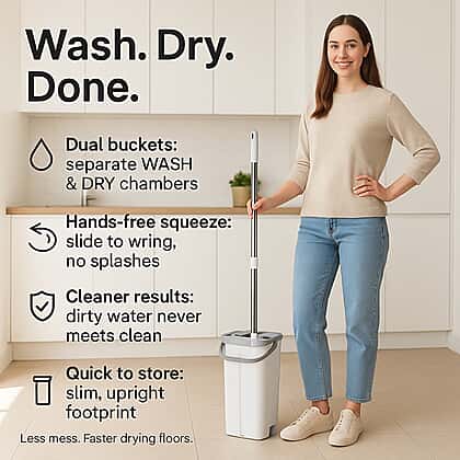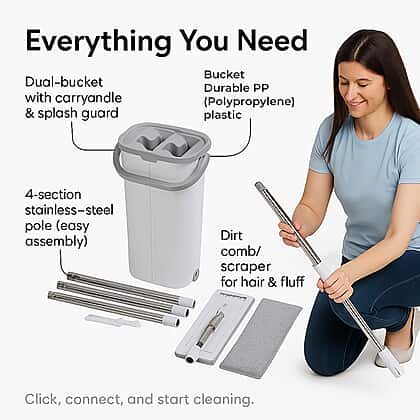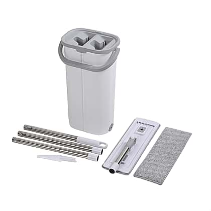 Make cleaning effortless with the 3-in-1 flat mop with bucket, designed for efficiency and convenience. Featuring a stainless steel splicing rod and 180-degree rotating mop head, it effortlessly reaches under furniture and into tight corners. The microfibre mop pads provide superior absorption, trapping dust and dirt with ease. The compact white and grey bucket is built for durability and space-saving storage, with a suspension design for easy hanging. Whether tackling spills or deep cleaning floors, this lightweight yet sturdy set ensures a streak-free finish, making it an essential addition to your cleaning routine.