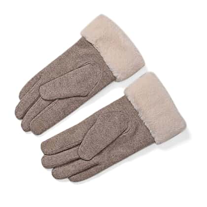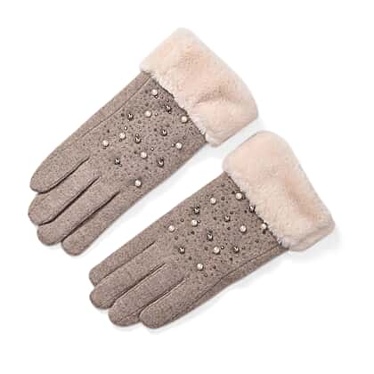 Luxurious Cashmere Beaded Gloves with Faux Fur Cuffs - Beige