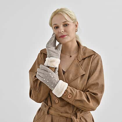 Experience the ultimate warmth and comfort with these luxurious cashmere beaded gloves in beige colour. Meticulously crafted from soft and breathable material, including 70% Cashmere Wool, 30% Polyester, these gloves offer durability and, with their faux fur cuffs, offer comfort. The beaded design enhances its beauty, creating a piece suitable for every winter outfit. These screen-friendly gloves offer comfort and warmth, whether you are styling for special occasions or everyday attire. Lightweight yet easy to wash, these gloves are easy to care for and can be washed in a machine, offering a very soft touch. Add a touch of warmth and comfort to your style this winter with these luxurious cashmere beaded gloves.