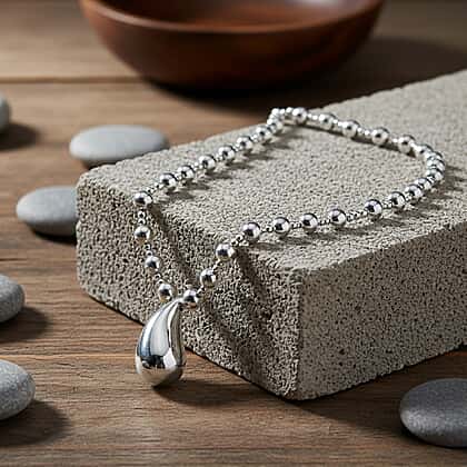 A fresh take on a teardrop necklace, the chunky silver bean necklace adorned with round beads looks utterly modern. It features a large and two small beads in an alternating style. At the heart lies a slightly curved pear-cut shaped, sculpted silhouette. The centre piece features a smooth, rounded bottom with a pointed tip that is slightly curved on one side. Crafted in pure brass and polished with white gold colour, this necklace has a chunky feel and is simply statement-making. Style these pieces with puff accessories to strike a cohesive look.