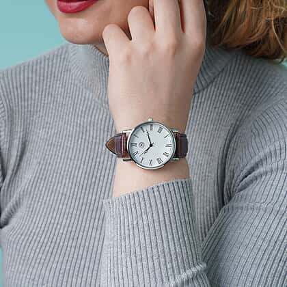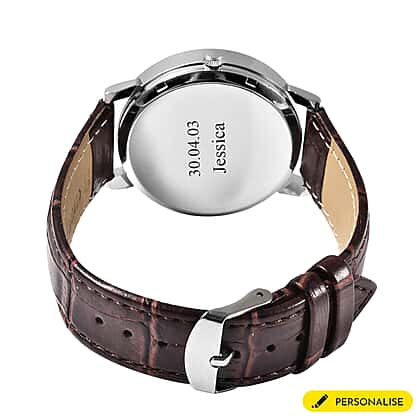 Personalised Engravable STRADA Japanese Movement Watch with Silver Tone and Brown Strap