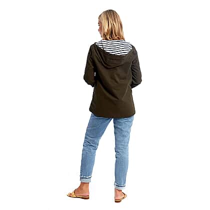 This stripe-lined 100% cotton jacket is from Betty Kay for a casual look. It features a zip closure, button fastening, and two side pockets for all your essentials. A concealed hood adds extra protection when needed with a stripe pattern.