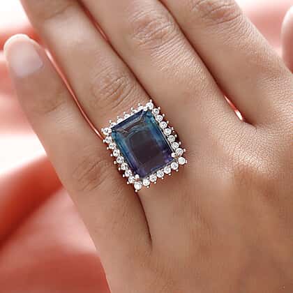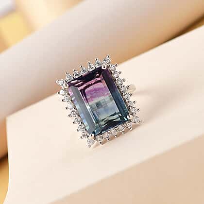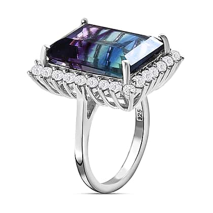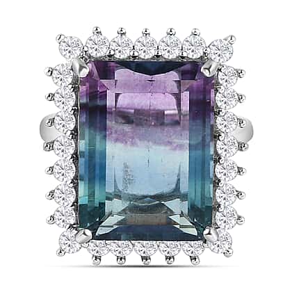 Bi Colour Fluorite and Natural Zircon Halo Ring in Platinum Overlay Sterling Silver 16.51 Ct.