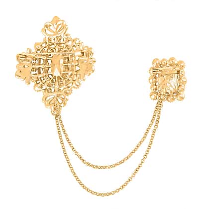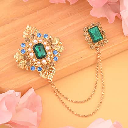 This exquisitely designed brooch showcases an assortment of faux gemstones that shower it with an otherworldly radiance. The simulated emerald is placed in the company of a beautiful array of multi-colored crystals. These high-quality Austrian crystals add a sparkle and bring different hues of blue and brown to this already magnificent piece. Yellow gold tone makes it look like premium jewellery.