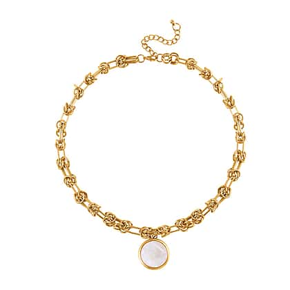 - The round white shell pearl charm is connected to the chain
