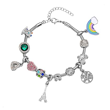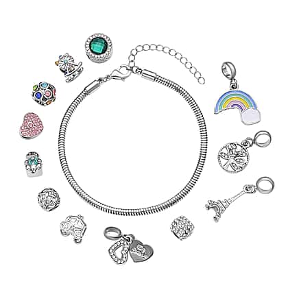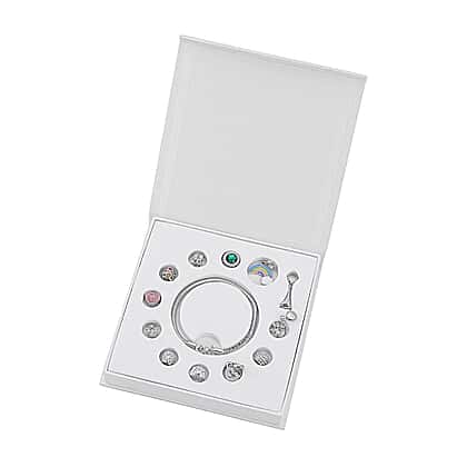 This snake bracelet with twelve charms set allows you to create a different style each time you go out. This set perfectly matches the saying, the more, the better. This shimmering set comes with a snake bracelet and different charms, which can be styled through easy sliding. Each joy brings uniqueness and together makes a solid appearance on your wrist. The multi-coloured enamelling and crystals used in the charms create a positive experience for each onlooker. This set will alone make a jewellery collection for you or someone special.