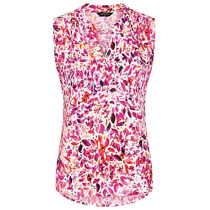 Brighten up your everyday style with this Emreco abstract leaf print mandarin collar sleeveless blouse in pink. Designed with a flattering V-neckline and curved hem, it offers a relaxed yet elegant fit that suits any occasion. The lively leaf pattern adds a splash of colour and personality, while the sleeveless cut keeps it cool and versatile for layering. Crafted from a soft blend of 94% polyester and 6% elastane, this blouse provides comfort, stretch, and easy care. Ideal for both casual and dressier looks, it’s a perfect piece for effortless summer styling.