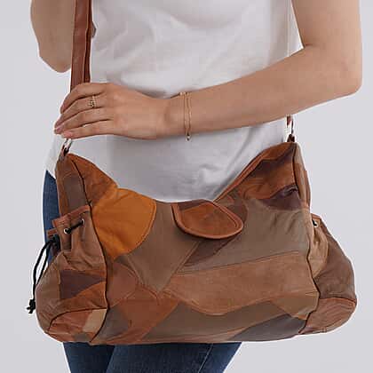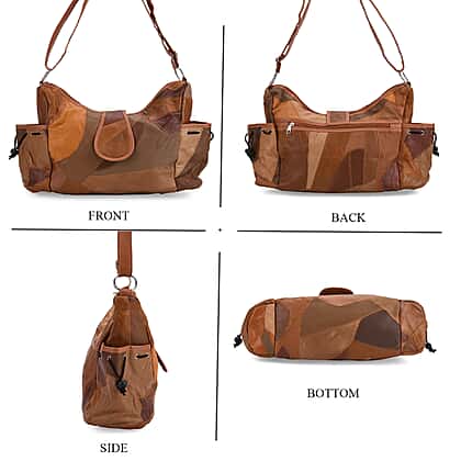 Embrace effortless sophistication with this camel-toned genuine leather patchwork crossbody bag. Carefully made from reclaimed leather pieces, this eco-conscious accessory is built to last while elevating your day-to-day wardrobe. The warm camel colour blends beautifully with casual and smart outfits alike, while thoughtful details like two side compartments and a zipped back pocket offer functionality without compromising style. Its roomy interior and reliable zip closure make it perfect for commuting or errands, while the adjustable strap ensures comfort all day long.