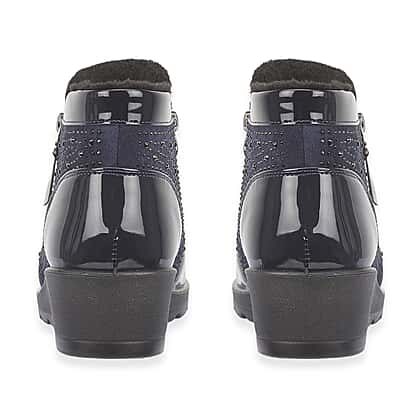 BLACK FRIDAY EXCLUSIVE - Shoetree Comfort Sadie Ladies Warm Lined Faux Sherpa Wedge Ankle Boot With Twin Zips - Diamante Trim (Size 5) - Navy