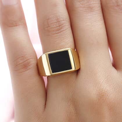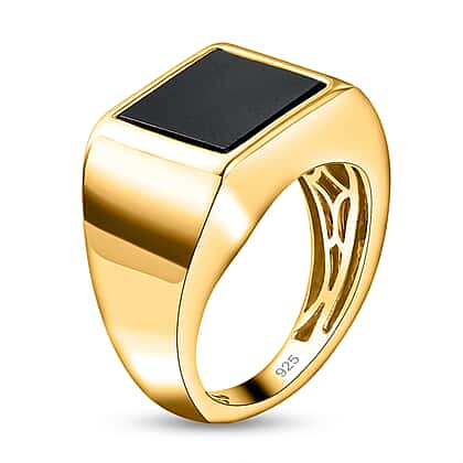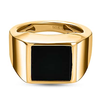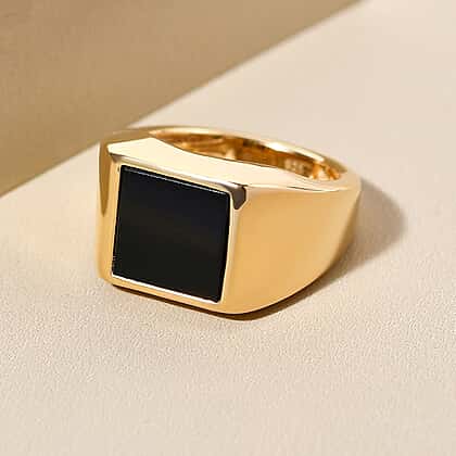 The solitaire ring is studded with a square button cut Black Onyx gemstone in a bezel setting. Black onyx is one of the most popular varieties of onyx. The solitaire ring features 3.61 carats of black onyx in the centre with a durable frame. This ring is crafted in 14K vermeil gold plated sterling silver and has a solid classic lustre that will last for years, even with regular wear.