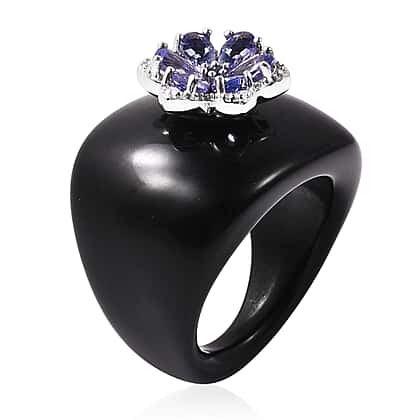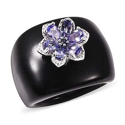 Black Onyx, Tanzanite and Madagascar Blue Sapphire Floral Ring in Rhodium Overlay Sterling Silver 51.80 Ct.