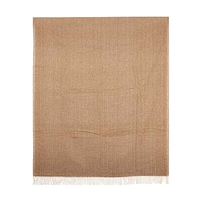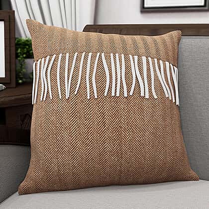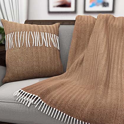 2 Piece Set Herringbone Pattern Wool Throw Blanket with Fringe 135x170cm and Cushion Cover in Brown 43x43cm