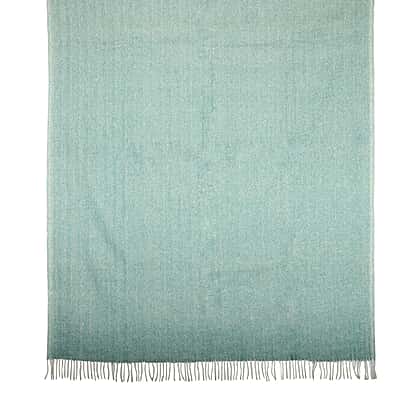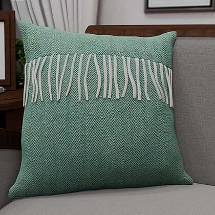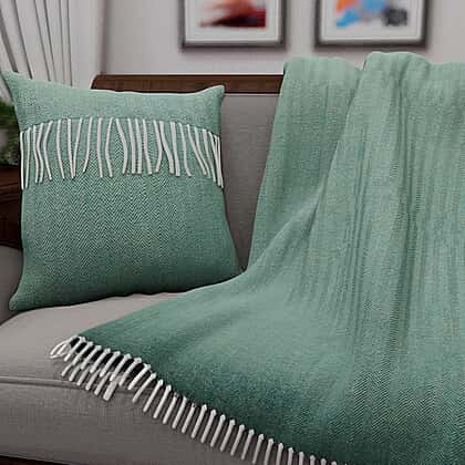 2 Piece Set Herringbone Pattern Wool Throw Blanket with Fringe 135x170cm and Cushion Cover in Green 43x43cm