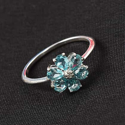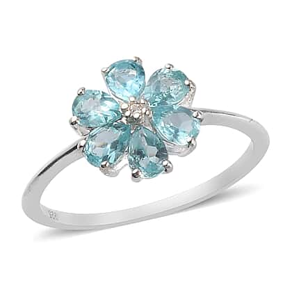 Blue Apatite and Natural Cambodian Zircon Flower Ring in Sterling Silver 1.01 Ct.