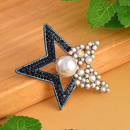 Blue Austrian Crystal, Simulated Mercury Mystic Topaz and Simulated Pearl Star Brooch in Silver Tone