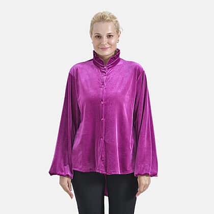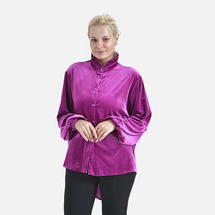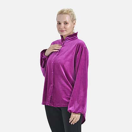 Add a touch of luxury to your wardrobe with the La Marey velvet blouse in an enchanting purple shade. Made from a high-quality blend of 95% polyester and 5% elastane, this blouse offers a soft, velvety texture and a relaxed, flattering fit. It features a sophisticated classic collar, a button-down front, and long sleeves with elasticated cuffs for a refined look. The curved hem adds a contemporary touch, making it easy to pair with your favourite trousers or skirts. Ideal for work, casual outings, or formal events, this blouse combines style and comfort effortlessly.