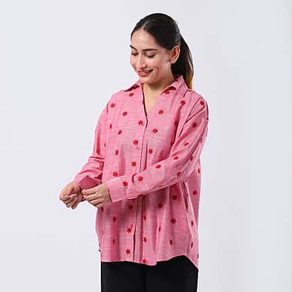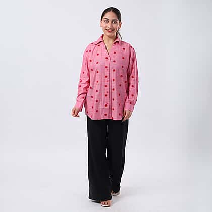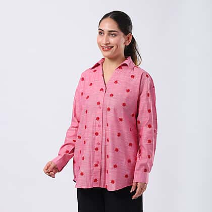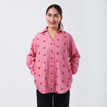 Bright, effortless and easy to wear this relaxed fit pure cotton embroidered shirt brings a cheerful lift to any everyday look. Made from 100% cotton, the fabric feels light and breathable – ideal for keeping comfortable through the day. The shirt features vivid red floral embroidery on a warm pink base, paired with a V-neckline, classic collar and full button front. Designed in a relaxed fit with long sleeves and handy side pockets, it’s easy to style solo or layered. Whether you’re off for errands or brunch with friends, this shirt offers that just-right balance of comfort and charm.