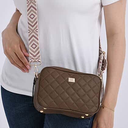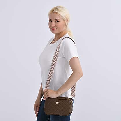 Stylish Quilted Crossbody Bag with Patterned Strap - Brown