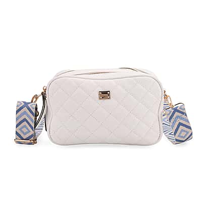 Stylish Quilted Crossbody Bag with Patterned Strap - White