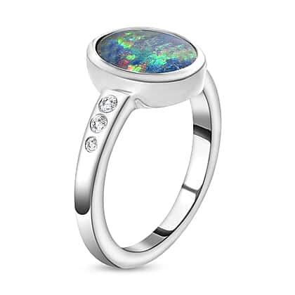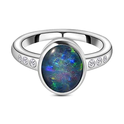 Get ready to drape your finger with the intrinsic inky and blacked violet hues of this Boulder opal triplet and zircon ring and charm your attire for every outing. The oval cabochon cut boulder opal is a bezel set in the centre of this ring with natural Cambodian zircon covering the shoulders. This opal ring is crafted in platinum overlay sterling silver, providing a lustrous and solid base to the unique gemstone. Get this ring to allure your fingers, or gift it to someone special in your life.