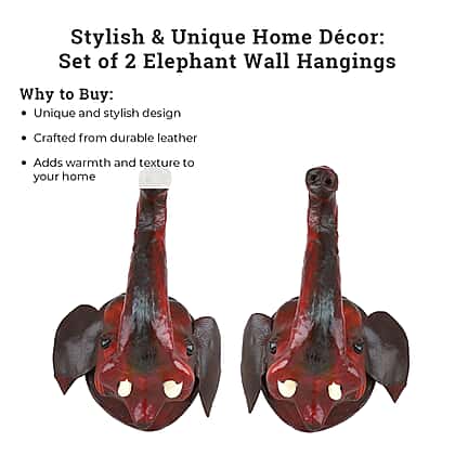 Enhance your home with the Boutique Collection - set of 2 genuine leather elephant wall hangings. These high-quality leather wall-mounted pieces add warmth and texture to your interiors, creating a unique and stylish atmosphere. The elegant elephant design symbolises power and goodluck, making them perfect for any living room or office. The texture details add a sophisticated touch, ensuring durability and a polished look. Easy to hang and handle, these wall hangings are a stunning addition to your decor, bringing a touch of nature and elegance to your space.