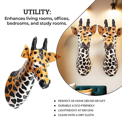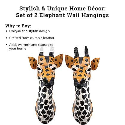 Enhance your home with the Boutique Collection - set of 2 genuine leather giraffe wall hangings. These high-quality leather wall-mounted pieces add warmth and texture to your interiors, creating a unique and stylish atmosphere. The elegant giraffe design symbolises good omens and protection, making them perfect for any living room or office. The texture details add a sophisticated touch, ensuring durability and a polished look. Easy to hang and handle, these wall hangings are a stunning addition to your decor, bringing a touch of nature and elegance to your space.