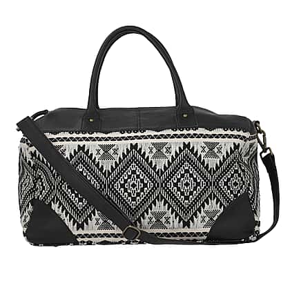 Closeout Deal - 100% Genuine Leather Handmade Jacquard Holdall Luggage Bag - Black