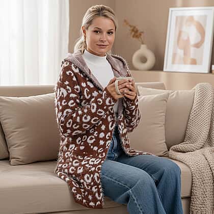 Tamsy Leopard Print Winter Hoodie with Pockets (Free Size, Fits 8 - 20) - Brown & White