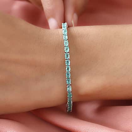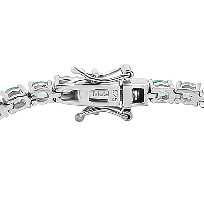 The tennis bracelet is studded with Boyaca Colombian Emerald in a prong setting. The gem is known for its lovely green hue, and it is the birthstone of May. The design is created by interlinking the symmetrical pattern studded with Boyaca Colombian Emerald connected by a thin platinum plated sterling silver chain. The bracelet comes in a lockbox clasp.