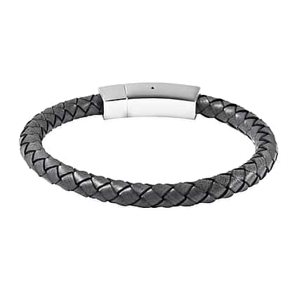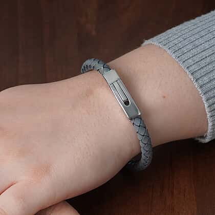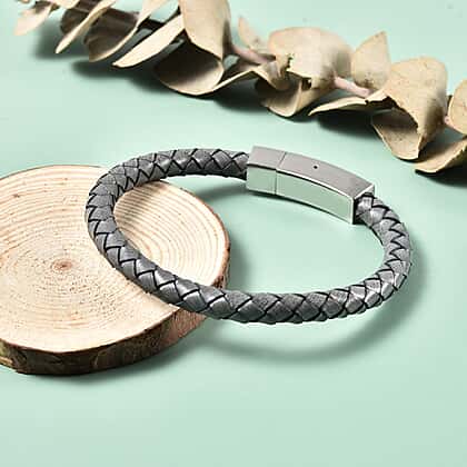 100% Genuine Leather Bracelet (Size 8) with Magnetic Lock in Stainless Steel - Grey