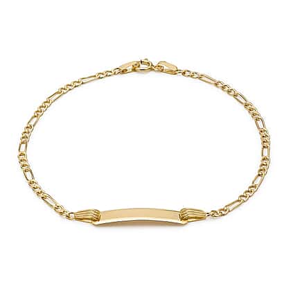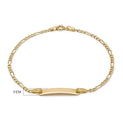 The best accessory for parents, style your children with this bracelet featuring a classic 9K yellow gold Figaro chain design with a secure lobster clasp, and has an ID tag that can be engraved with their name or initials. Made of high-quality gold, this bracelet is sure to last for years to come.