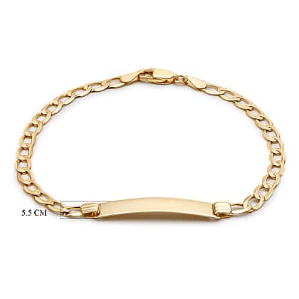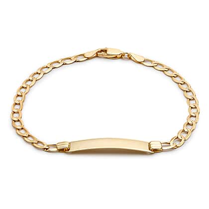 Make a bold statement with this stunning 9K Yellow Gold ID Bracelet. Measuring 25mm in width and 5.5mm in thickness, it features a sleek and stylish flat curb chain design that is sure to turn heads. The ID tag in the centre can be engraved with a personal message or initials, making it a thoughtful and unique gift.