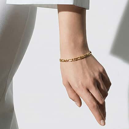 A figaro bracelet that carries brilliant shimmering links in a pattern that showcases three small oval links followed by an elongated oval link. The diamond cut of this necklace adds facets, ensuring that light is captured and bounced off its surface. This bracelet is 7.5 inches long and sits between around your wrist in a comfortable fashion.