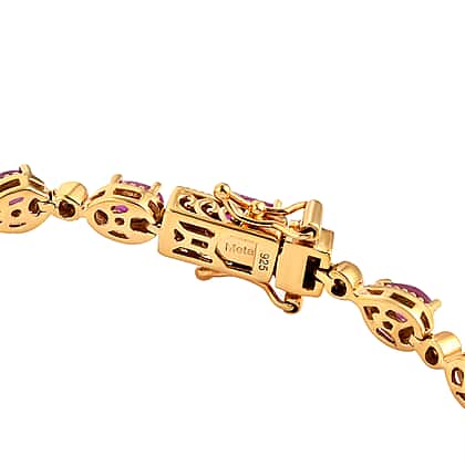 A tennis bracelet design inspired the design of this bracelet. The bracelet is made of Gold Plated sterling silver with African Ruby. The gemstone comes in three shapes oval, octagon and pear studded in a prong setting. The gemstone has a perfect blend of Purple and dark red, giving it an ideal hue of red.