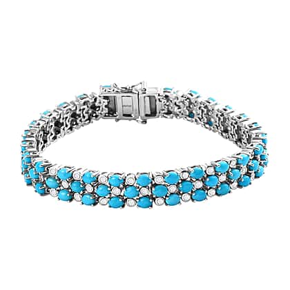 The splendid sky blue of Arizona Sleeping Beauty turquoise stones combines with the sparkle of natural Cambodian zircons in this classic tennis bracelet. Fashioned in platinum overlay sterling silver, the design is an interesting twist on the diamond line bracelet, making it a versatile piece of jewellery that can be worn on any occasion and paired with a wide variety of outfits.