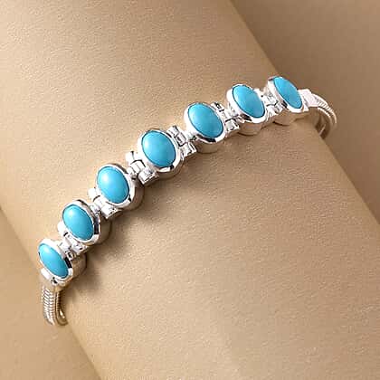 Made with 7 Arizona sleeping beauty turquoise cabochons, this bracelet is a vibrant statement in luxury. Named after the mining locations in Arizona which closed in 2013, these stones are very valuable and rare. The oval-shaped stones are bezel set for maximum visibility. The bracelet has been crafted in sterling silver that accentuates the Arizona blue colour of the turquoises.
